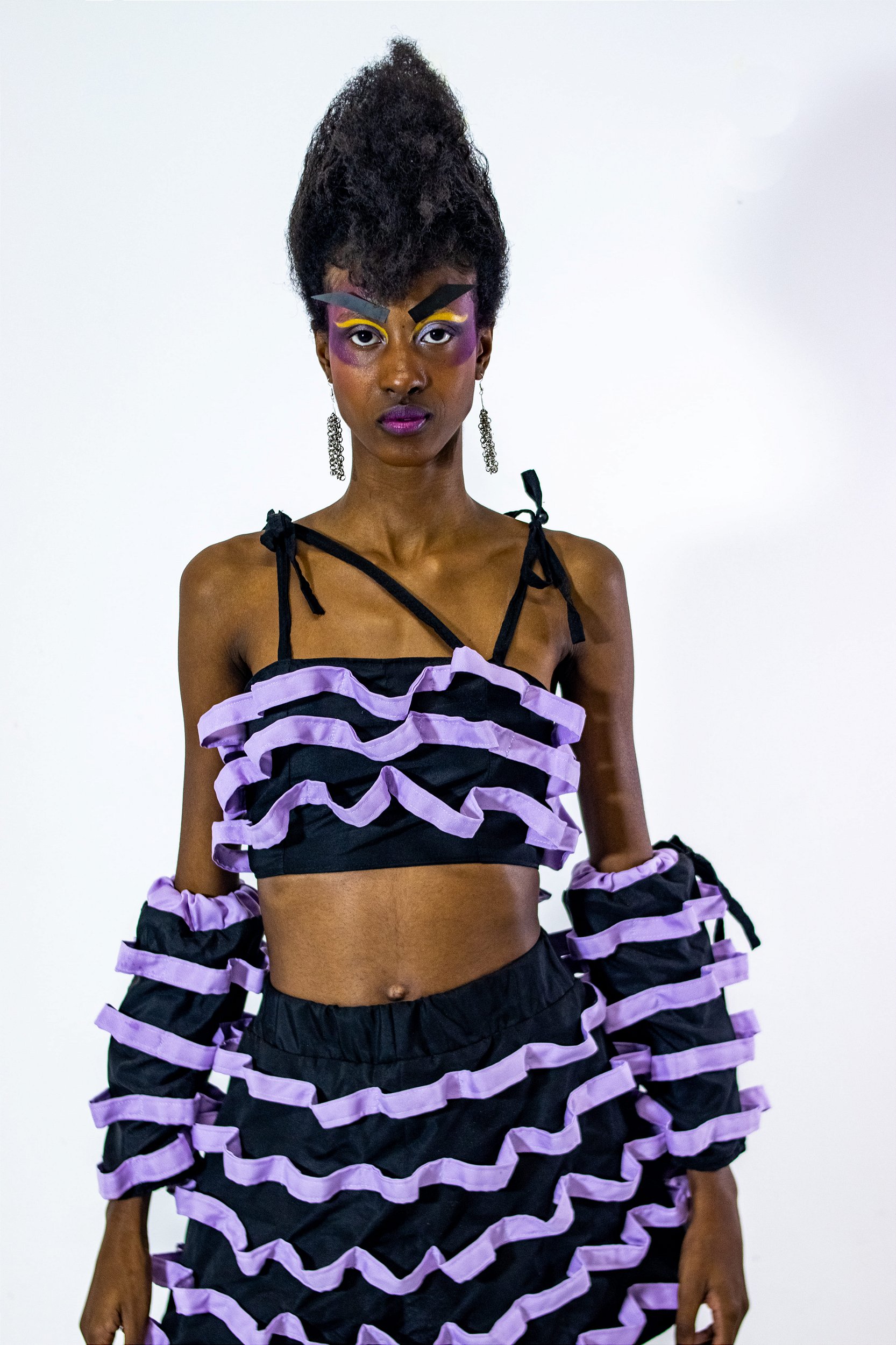 Com visual marcante e inspiração na arquitetura modernista, as Mangas Polaina Copan trazem babados estruturados em camadas e caimento que valorizam o movimento. O contraste de cores e formas orgânicas transforma as peças em destaque no look.