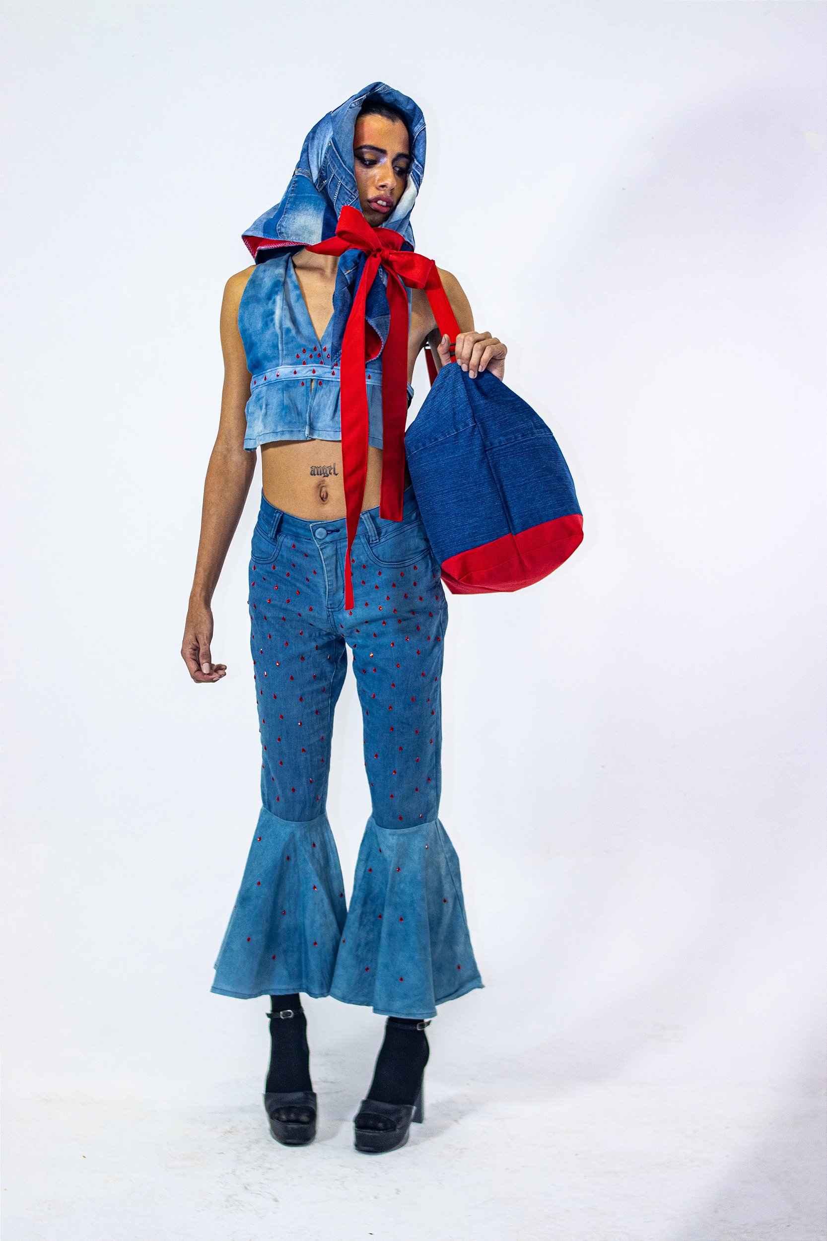 Exclusivo e sustentável, o Top Pampulha é produzido a partir de calças jeans reaproveitadas e bordado com pedras vermelhas. Cada peça carrega a autenticidade do upcycling e pode apresentar variações únicas que contam sua própria história